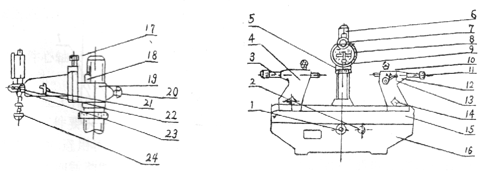 安置在儀器底座16上的臺面15,可用膠木手輪1通過齒條傳動機構作縱向移動,并借助膠木螺母2固定。在臺面上的左右頂針架4、12可沿臺面上的基面作縱向移動,可用膠木螺母14固定。頂針3松開膠木螺釘10后可在頂針架孔內移動。在右頂針架12上還可用膠木螺釘11緊固頂針3后借助于手柄13作彈簧頂針用。轉動升降螺母5,可使測量座19連同測量支架8和千分表7沿立柱6上下移動。使側頭與被測表面接觸或離開。并用膠木螺釘20使之固定在適當的部位。松開緊固螺釘17測量支架8可相對于測量座在垂直平面內作±900的轉動。表架23可利用手柄21抬起或放下。